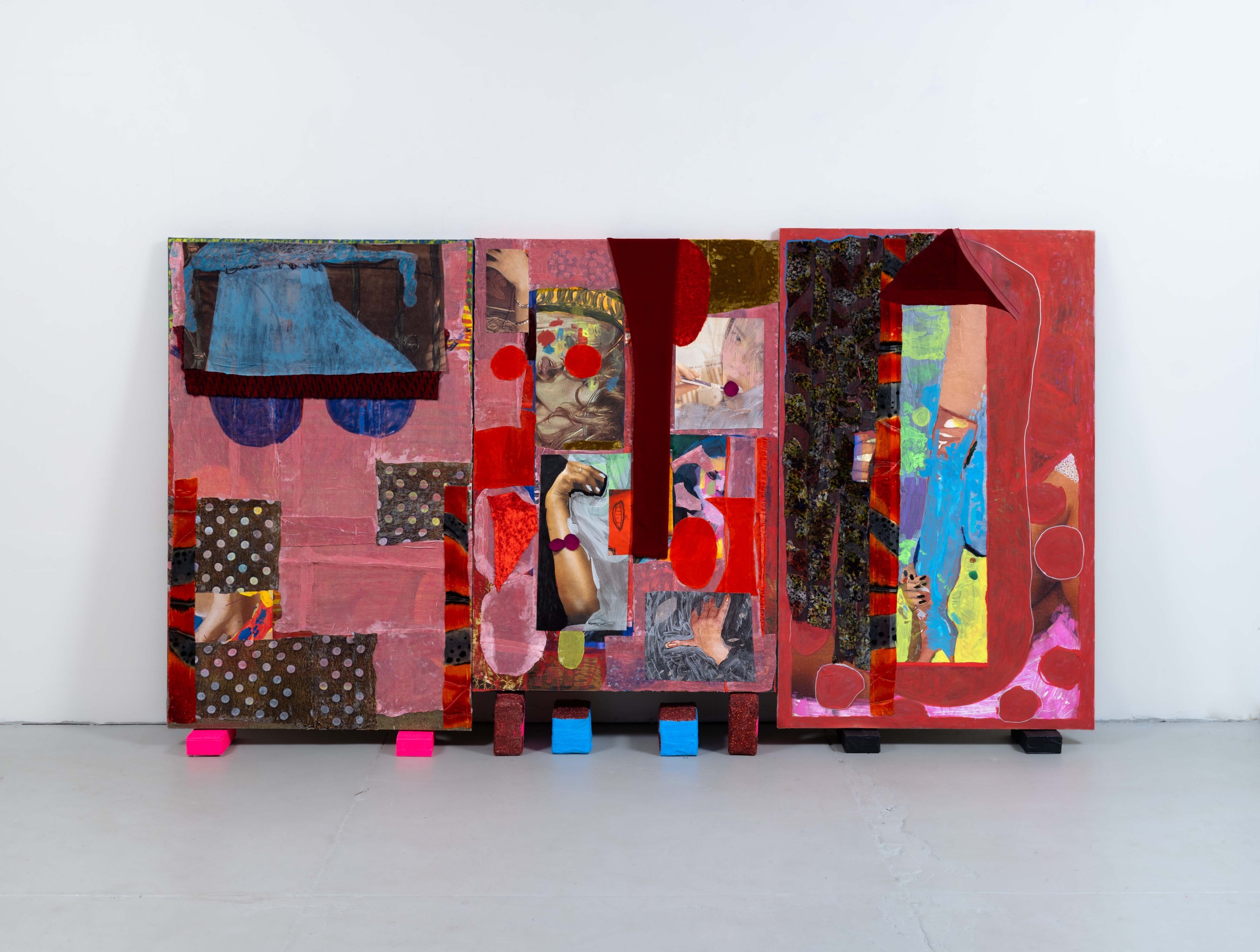 Glitter Triptych, 2023. Ink, acrylic, velvet, faux fur, polyester, faux fur, printed canvas, tape, glitter, bricks. 67 x 122 x 16 in.