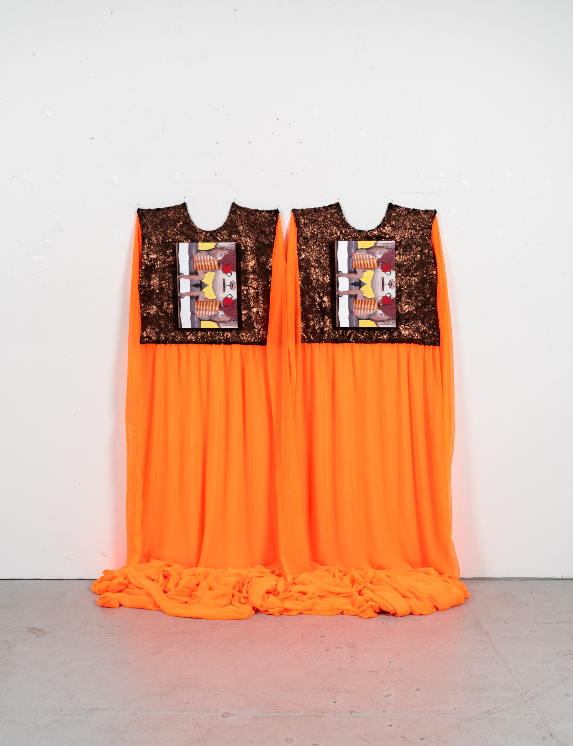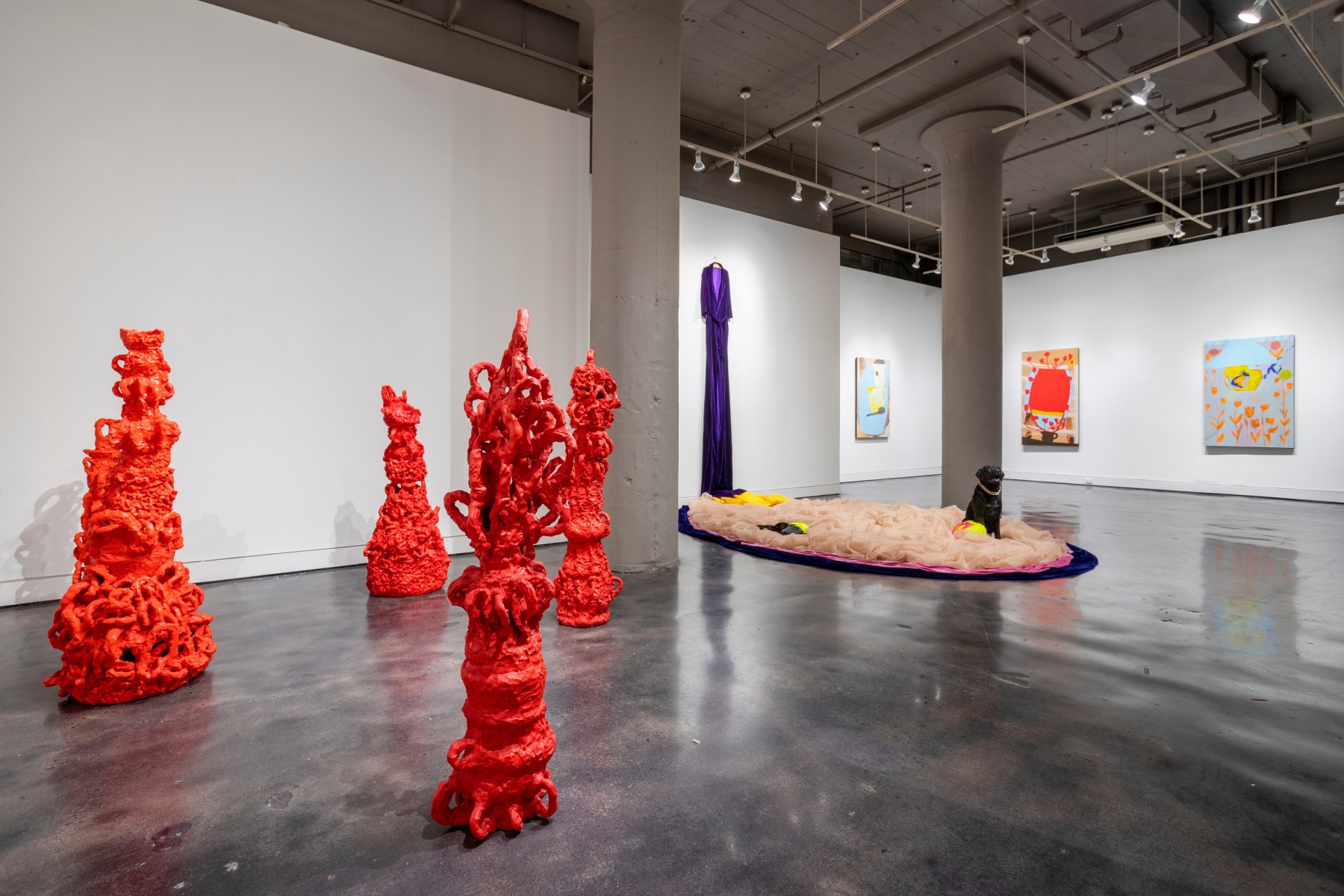 Marigold, 2022. Velvet, organza, faux fur, silk, Alexander McQueen dress, stuffed and taped AMQ clutch purse and strap, taped AMQ shoes, painted plastic resin dog with AMQ clutch purse chain. 118 x 118 x 171 inches.