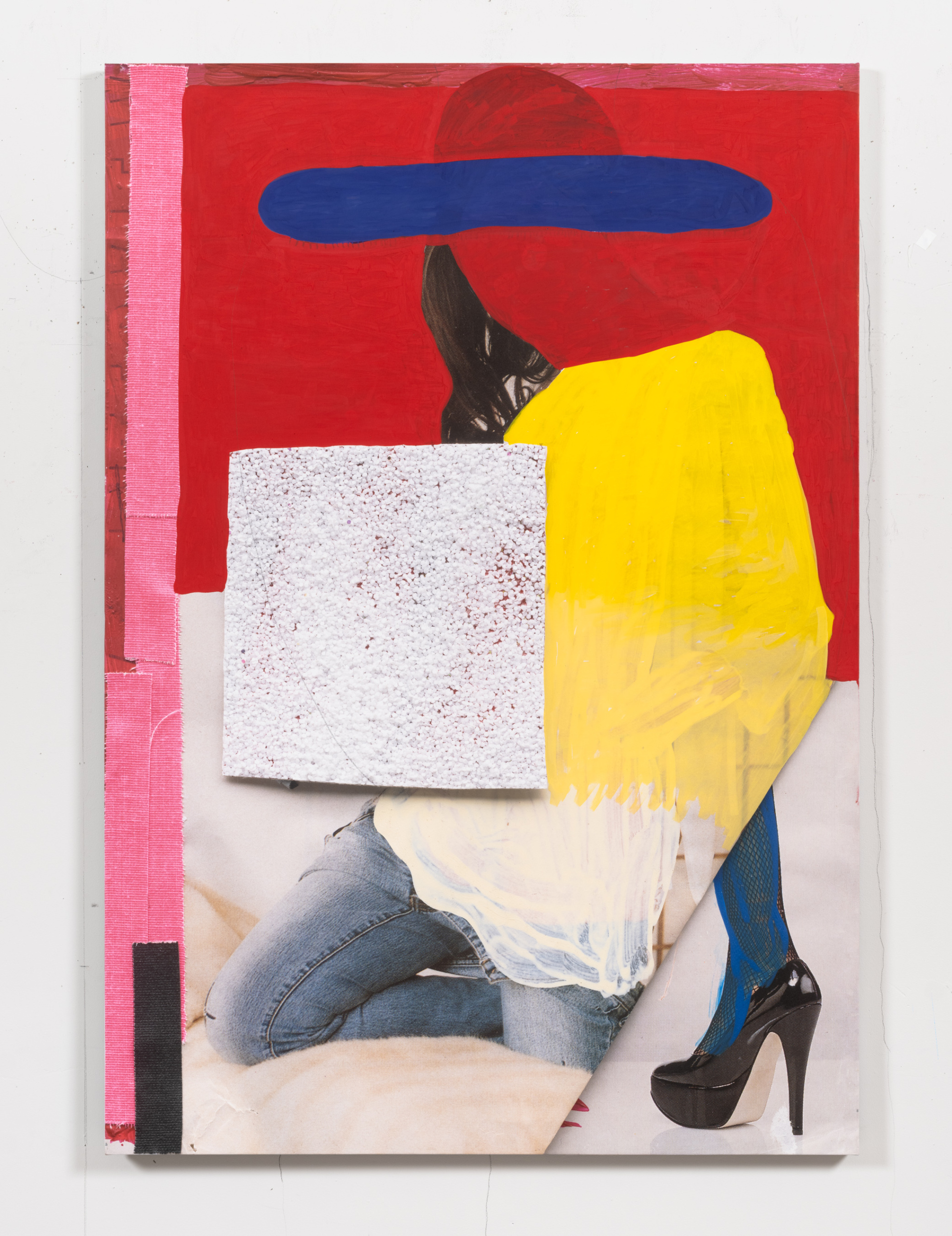 Flip, 2024. Faux fur, chiffon, acrylic over photograph printed on canvas. 81 x 67 x 23 in.