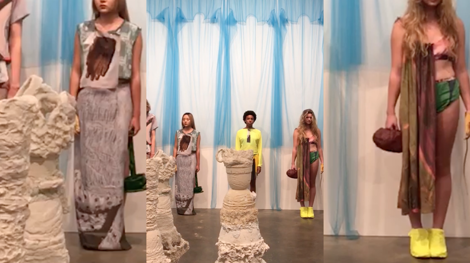 CarWash Collective Fashion Show, 2016 (Video still). Digital video loop. 2:47 min. Models: Grace Choi (L), Camille Segre-Lawrence (M), BK Schmitz (R)