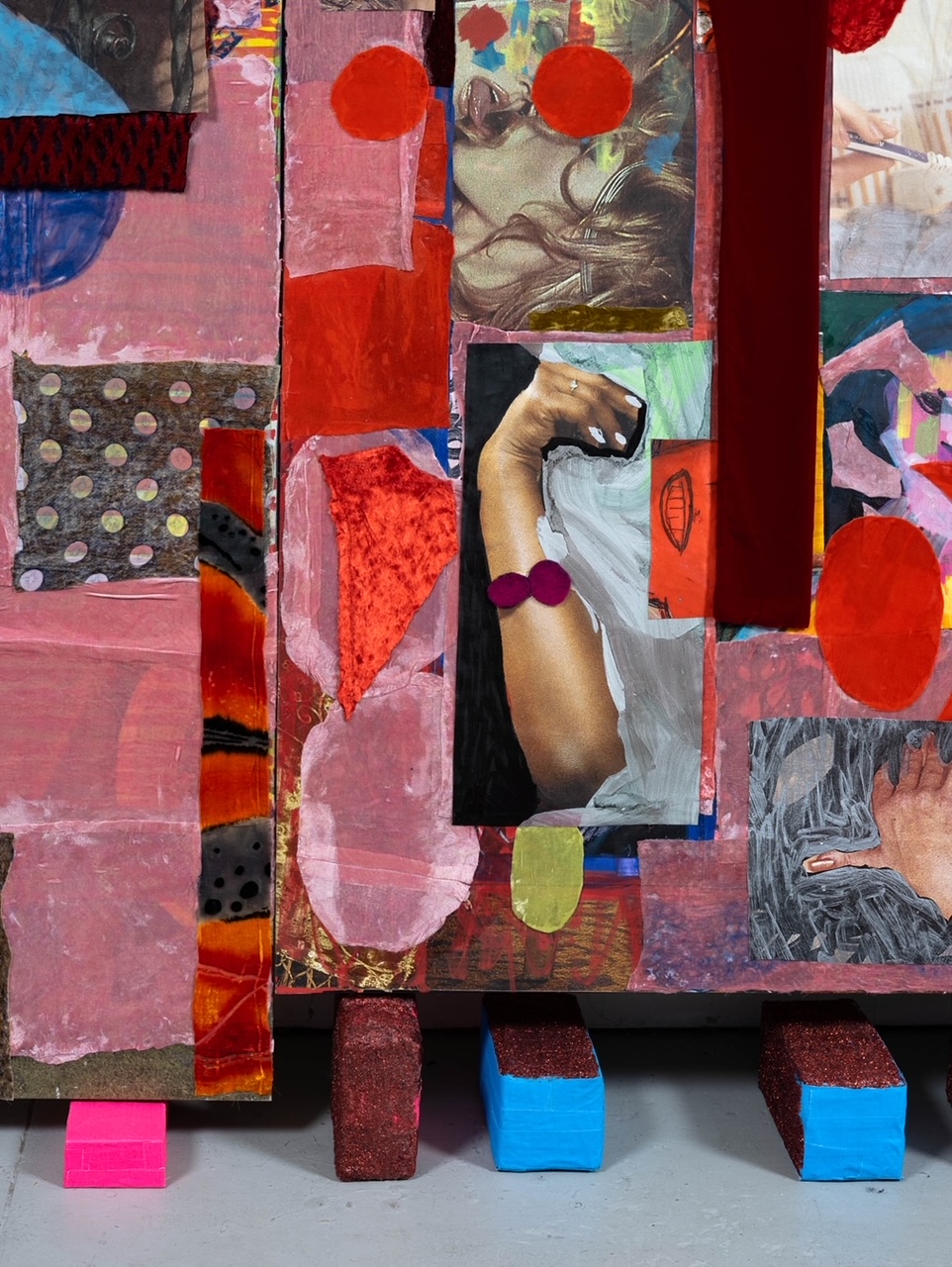 Glitter Triptych, 2023 (Detail). Ink, acrylic, velvet, faux fur, polyester, faux fur, printed canvas, tape, glitter, bricks. 67 x 122 x 16 in.